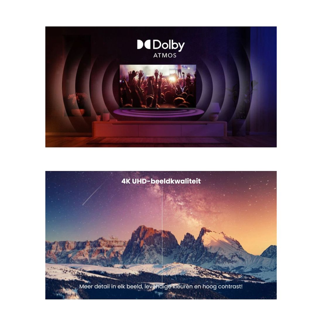 Geniet van 4K UHD-resolutie (3840x2160) tot 60 fps. Ondersteuning voor HDR10, HDR10+ en HLG zorgt voor levendige kleuren, diepe contrasten en haarscherpe details. Elk beeld, van lichte scènes tot donkere schaduwen, komt tot leven. Perfect voor films, series, sport of je favoriete online video’s.
