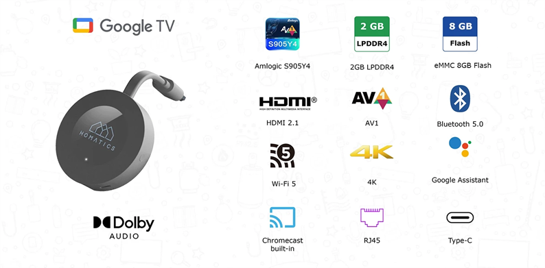 Homatics Dongle G 4K Google TV is een 4K UHD streamingapparaat met Google-certificering voorzien van het nieuwste Google TV-besturingssysteem (versie 11) en is ook nog eens een 4K Chromecast. Dit compacte apparaat verandert elke tv in een krachtige Smart TV. Met de AMLogic S905Y4-processor met 16500DMIPS, 2GB LPDDR4 RAM en 8GB eMMC Flash is dit een superkrachtige Dongle met snelle reactietijden.