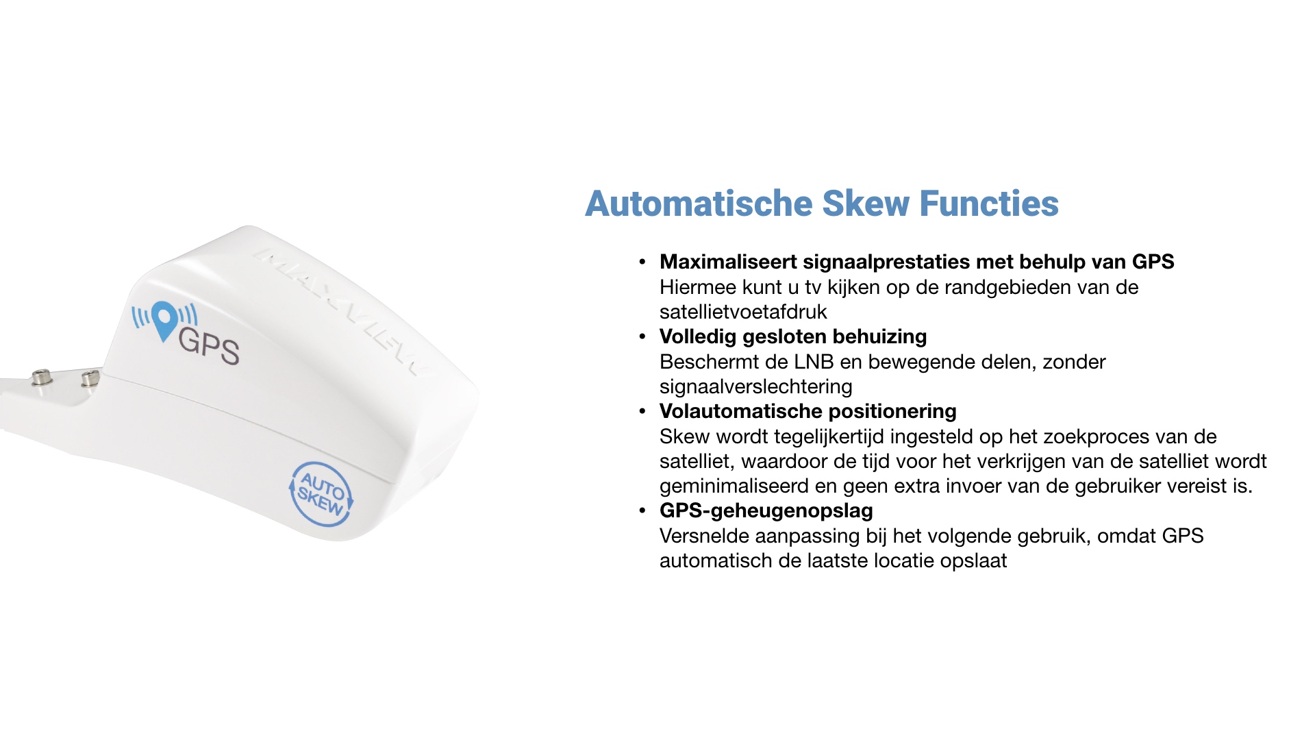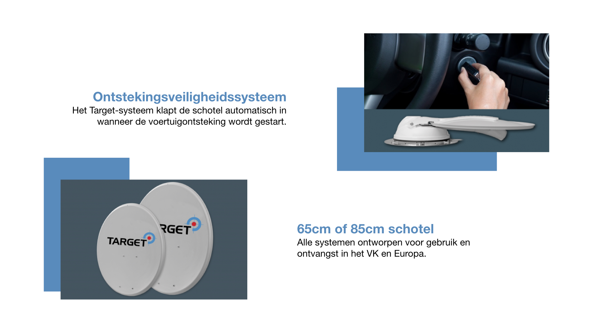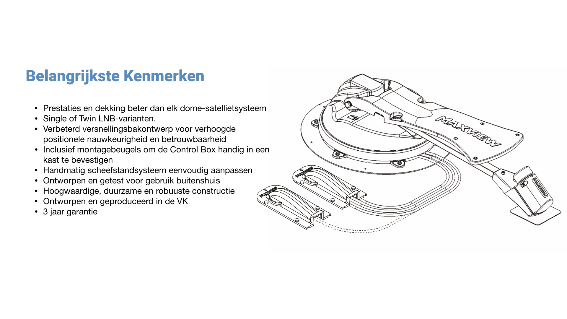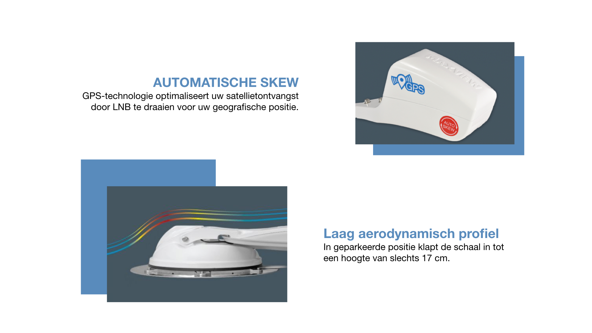 De Maxview Target Auto-Skew 85cm Twin is een volledig automatisch op het dak gemonteerd satellietsysteem, dat is ontworpen om satelliet-TV en radio uit Europa te ontvangen in uw caravan, camper of boot, met een druk op de knop! De Target is uitgerust met 5 voorgeprogrammeerde satellieten: Astra 1, Astra 2, Astra 3, Hotbird en Thor. Door het compact design beschermt de gesloten behuizing de LNB en de bewegende delen, zonder signaalverslechtering.