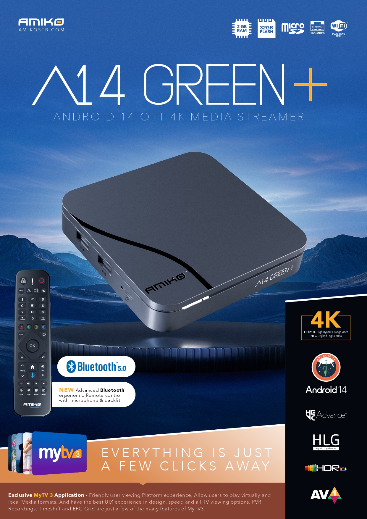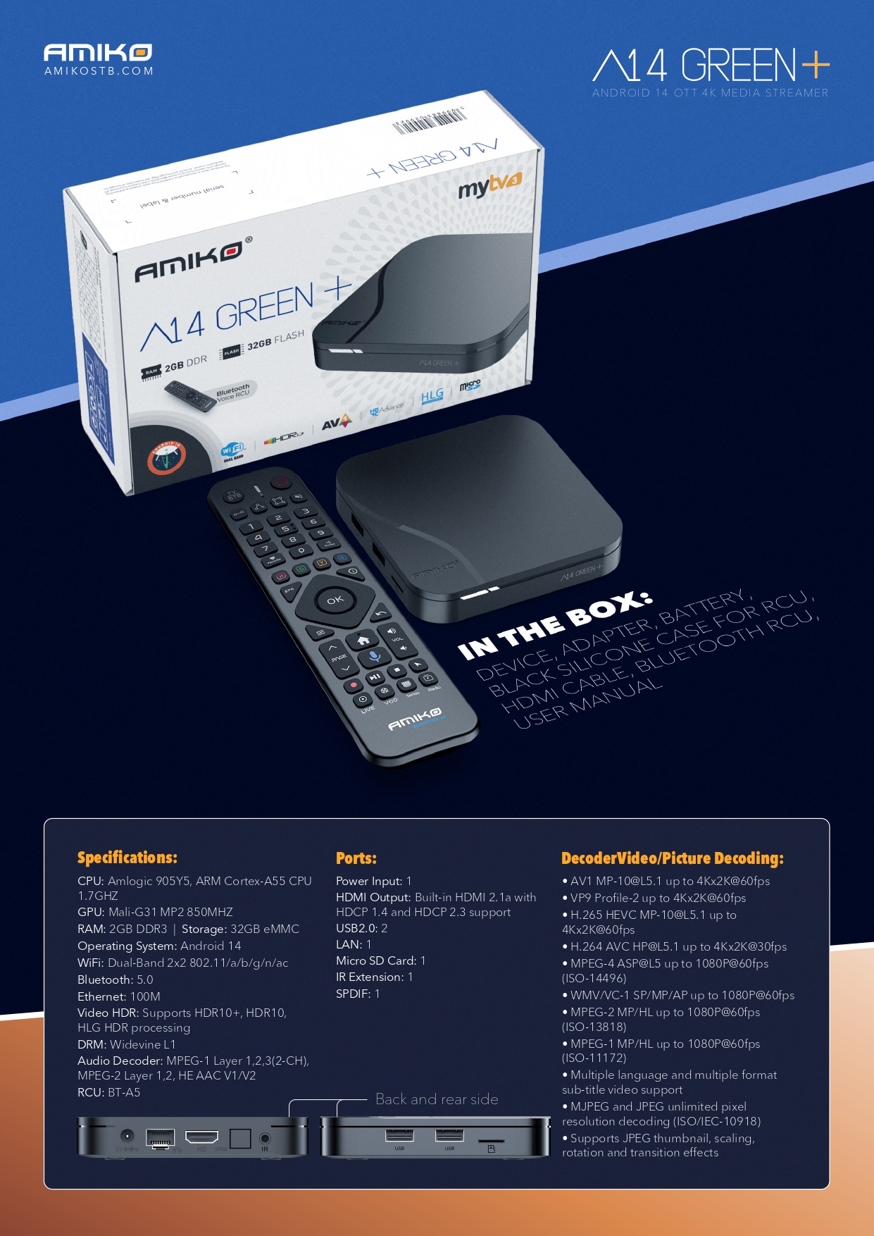 Ervaar next-level entertainment met de Amiko A14 Green+, de krachtige 4K UHD-streamingbox die alles uit je content haalt. Geniet van haarscherpe 4K-beelden met HDR10+, HLG en AV1-ondersteuning, vloeiende prestaties dankzij Android 14 en een Quad-Core processor. Met 32 GB opslag en 2 GB RAM heb je voldoende ruimte voor al je apps en media-content.