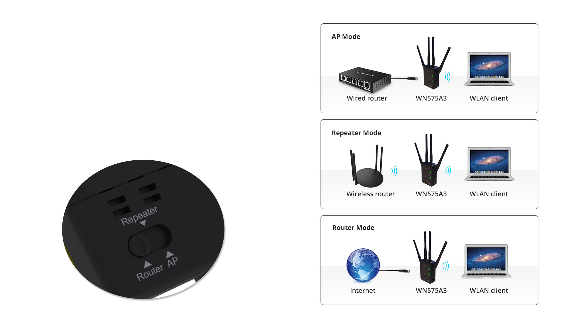 Twee handigere modi maken het flexibeler. 575A3 is niet zomaar een repeater, maar een draadloos toegangspunt (AP) of router en u kunt elke modus kiezen met de schakelknop.