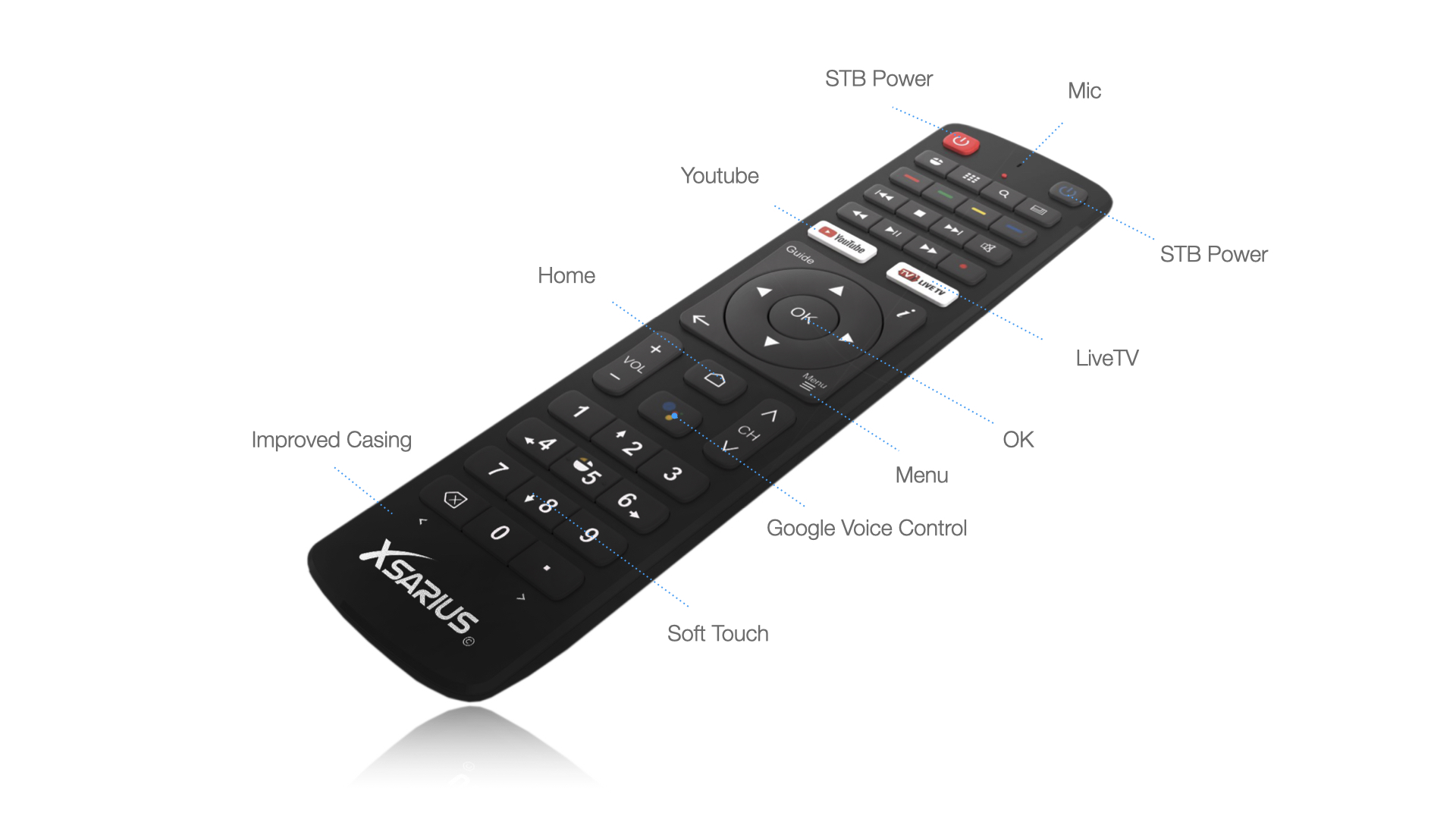 Verbeter uw gebruikerservaring met de Xsarius BT-afstandsbediening met vele functies, zoals: uw tv bedienen, YouTube bekijken, Google Voice gebruiken en nog veel meer.